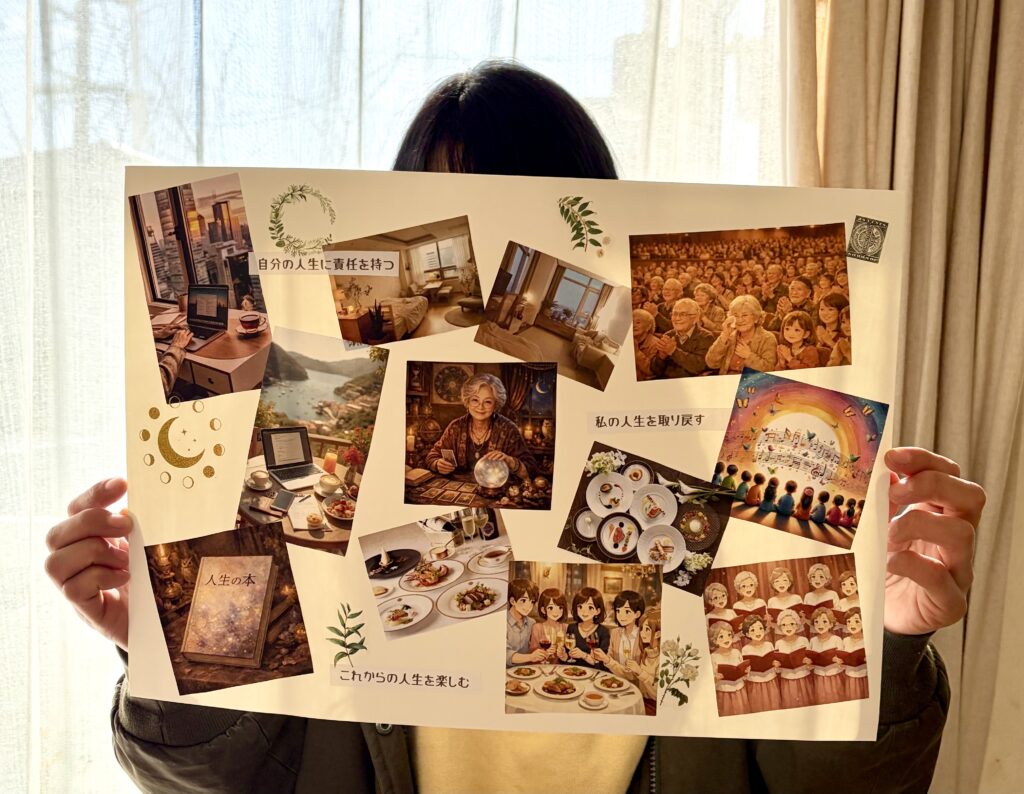 ビジョンボードが出来上がって見ていると、私ってこんなことしたいんだって客観的に感じることができるなって思いました。
